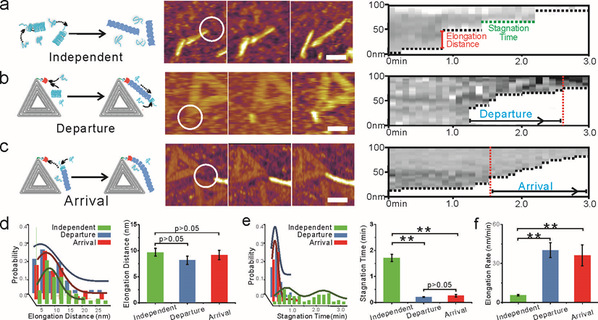 利用高速原子力显微镜(HS-AFM)原位探测CsgB-DNA折纸复合结构引导CsgA聚合的过程:(a)无CsgB-DNA折纸(独立模式);(b,c)有CsgB-DNA折纸(b,c)时CsgA纤维形成示意图以及相应的AFM高度图与形成CsgA纤维长度变换图: (d-f)比较在独立、出发和到达三种不同生长模式下,纤维每步生长所需的平均停滞时间和延伸速率。标尺:50nm