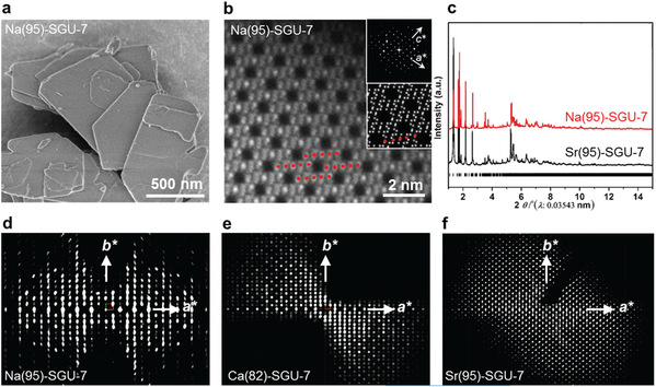SGU-7的SEM、HAADF 图像、同步辐射PXRD和三维电子衍射数据