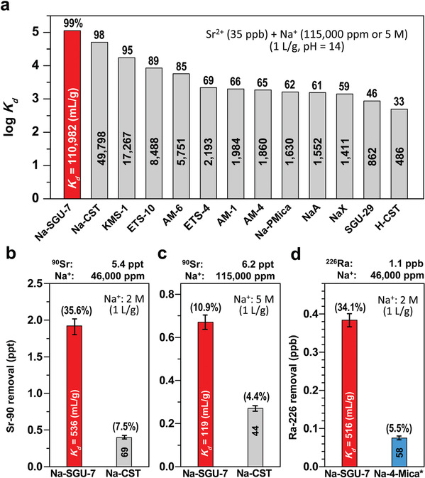 在该项研究中,韩国西江大学团队通过硅源和钒源在一定条件下的水解形成凝胶,经过老化和结晶,合成出一种新型层状钛硅氧化物(SGU-7)。该材料被证明可以通过离子交换在痕量Sr2+存在的情况下将其捕获和分离,更为特殊的是,该材料即使在高含量Na+离子的液体中也可以进行。