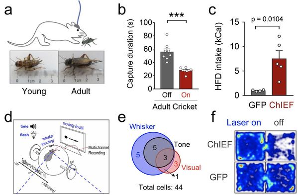 图1、光激活ZI GABA能神经元促进捕食和进食行为。a, 光激活促进小鼠捕食成年蟋蟀;b, 小鼠成功捕捉到蟋蟀所花时间;c,光激活促进小鼠对高脂食物(HFD)的进食量;d,多通道电生理记录感觉信号的原理;e, 响应胡须刺激、运动视觉以及声音的ZI神经元的重叠情况;f, 在实时位置偏好实验中小鼠偏好于光刺激侧。