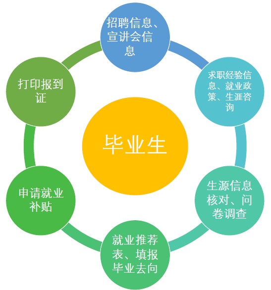 毕业生通过统一身份认证进入就业管理的后台,可以进行生源信息核对、填写问卷调查、申请就业推荐表、填写毕业去向、申请就业补贴、打印报到证等服务。此外,毕业生还可以在线预约“一对一”生涯咨询服务,进一步找准定位、预期发展、适配就业。该系统同时开通微信端服务,提供了手机操作的便利。