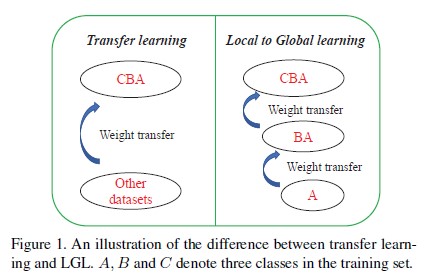 图2. LGL与迁移学习的区别,A, B, C代表训练集中的三个类