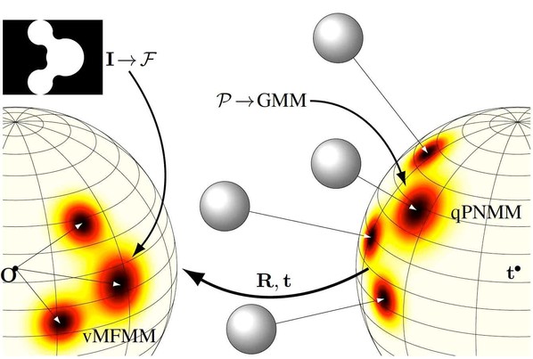图5.论文思路: 球体表示三维点云分布的高斯模型, 其目标是找到相机的位姿,使其在相机单元球面上的投影与测量到的投影点云分布一致