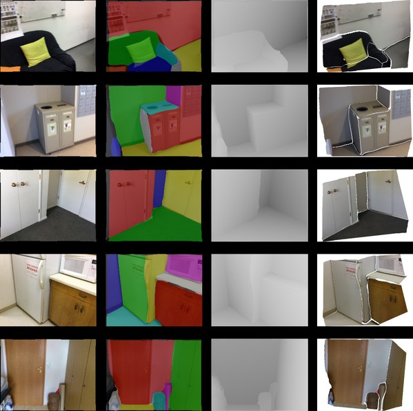 图4. 平面重建结果,从左至右分别为:输入图像,平面实例分割,深度图,重建的三维平面模型