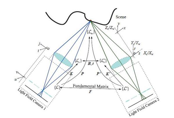 图7. 两个光场相机之间的光线空间投影模型和光线与光线之间的变换