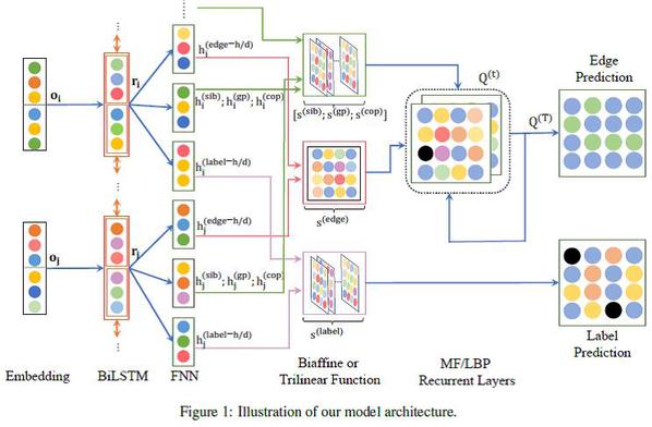 “Enhancing Unsupervised Generative Dependency Parser with Contextual Information” 一文提出了一种无监督句法分析的新型概率模型:基于神经网络的判别式价键依存模型(见图8)。“Second-Order Semantic Dependency Parsing with End-To-End Neural Networks”一文研究了旨在识别自然语言句子中单词间语义关系的语义依存分析,提出了一种二阶语义依存分析器,将两条依存边之间的相互作用关系考虑在内;使用两种推理算法对二阶分析进行近似,并将其转化为端到端神经网络进行训练,见图9。上述研究成果出自屠可伟教授课题组。除此之外,屠可伟教授课题组在与西湖大学张岳教授合作完成的“Latent Variable Sentiment Grammar”一文中提出了一系列情感语法,用于使用神经网络显式地建模情感组合。