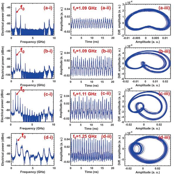 图一不同偏置电流下激光器的电谱(左),波形(中),和相图(右)。其中(a)和(d)为单周期振荡,(b)和(c)为双周期振荡。