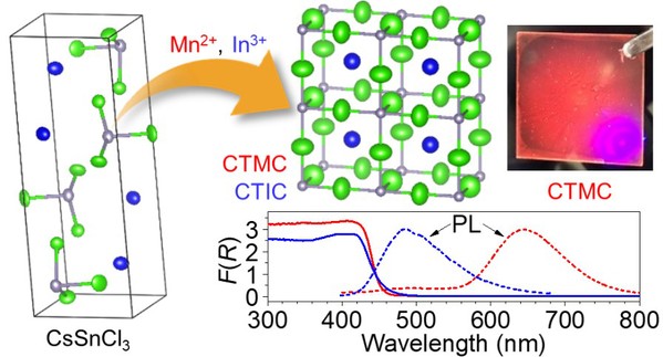 用Mn2+或In3+部分取代CsSnCl3中的Sn2+后,得到稳定的钙钛矿晶体结构以及优良的发光性质