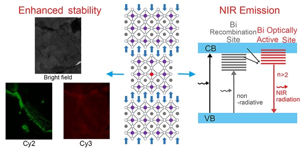 二维有机无机杂化钙钛矿是一种新型的半导体材料,因其独特的可调节光电性能和优异的稳定性引起了学界的重视,在光电器件中有着重要的应用前景。异价掺杂是调节半导体材料性质的经典手段,在传统半导体领域中有着广泛的应用。林柏霖课题组通过Bi3+离子掺杂,首次发展出一系列不同层数的异价掺杂二维有机无机杂化钙钛矿。作者发现Bi3+的异价掺杂可以灵活地调节二维钙钛矿的发光能力和荧光寿命,诱导产生近红外荧光,同时进一步结合DFT计算发现了不同层数的二维钙钛矿之间掺杂位点的异同以及近红外发光的原理。研究人员还发现,Bi3+掺杂对于二维钙钛矿材料的环境稳定性和光学稳定性具有明显的增强作用,并通过荧光显微成像揭示了一种提高稳定性的新机理。该工作为有机无机杂化钙钛矿稳定性的提升提供了一个新的基础原理,并为相应光电器件的维度工程应用提供了具有潜力的新型材料。