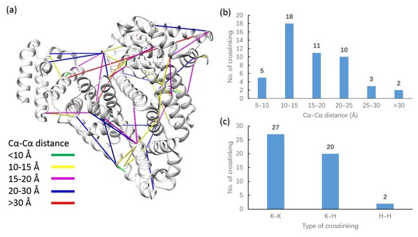 图2、报道的 BSA 3D结构对交联结果进行评价:(a) 将交联单元映射到 BSA 的 3D 结构上;(b) 鉴定出的交联单元的 Cα—Cα距离分布;(c) 鉴定出的交联位点的类型。柱状图上方数字表示交联类型的数量。