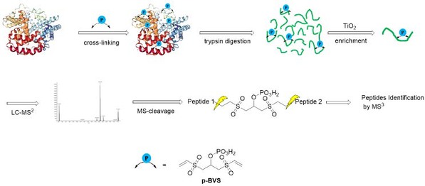 免疫化学研究所抗体化学实验室姜标教授团队长期从事乙烯基砜化合物与多肽或蛋白的偶联研究。乙烯基砜可以通过迈克尔(Michael)加成反应实现与蛋白和多肽偶联。但在高能量的诱导下,由于逆Michael 加成效应,不稳定的偶联键会碎裂解离。因此,该团队提出以乙烯基砜化合物作为一种新型的质谱可碎裂交联剂。