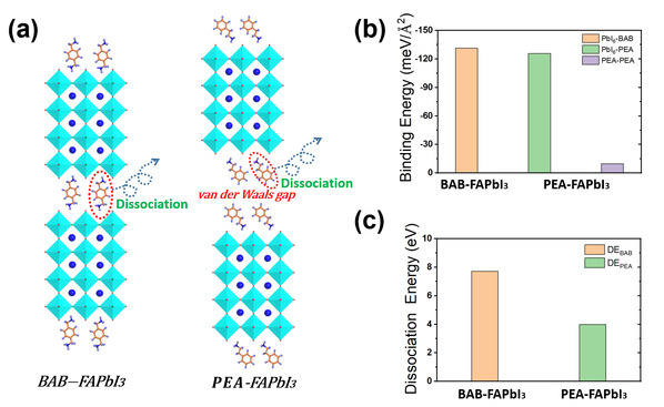 图1. (a)双氨基分子(DJ结构)和单氨基分子(RP结构)与层状无机钙钛矿的结合示意图;(b) 理论计算的结合能;(c)理论计算的分离能