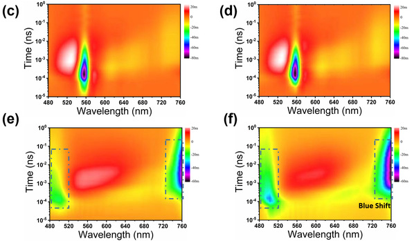 图2. Dion-Jacobson结构(c, d)和Rddlesden-Popper结构(e, f)在器件工作之前(c, e)和工作100小时后(d, f)的瞬态吸收光谱对比