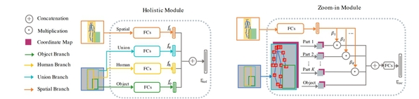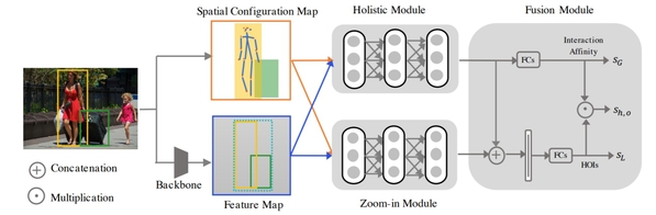 图一: 模型结构总览,模型的主要输入为输入图片的特征图和人和物体交互关系的几何信息以及人体的关键点。这两大信息将由Holistic model和Zoom-in module 在多层级上对特征进行处理和融合,最后对特征进行融合并给出预测。