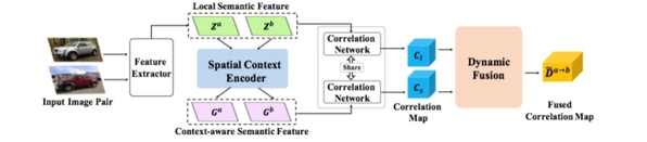 图3:算法模型的输入输出和流程的基本框图,算法模型主要包括三个模块,空间上下文信息编码器、对应关系感知网络、动态聚合网络。