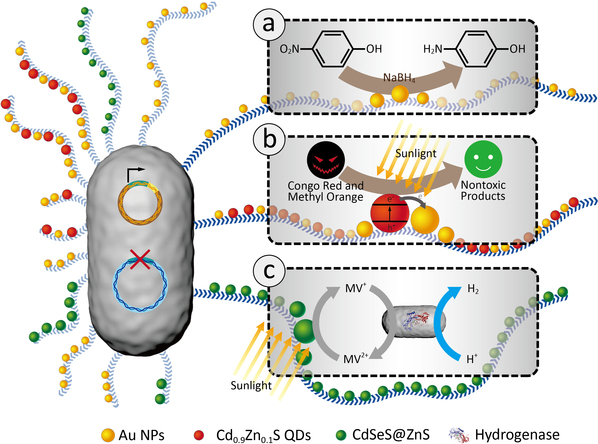 在2018年发表的《Advanced Materials》文章中,钟超课题组报道了基于基因工程改造的具有光感应能力的大肠杆菌,能够在光照条件下分泌并在胞外组装功能纳米纤维,并能对溶液中的无机纳米材料进行时空可控的图案布阵。在当前的研究当中,研究人员首先对大肠杆菌进行基因工程使其表达、分泌并在胞外组装带有组氨酸标签的淀粉样蛋白纤维,然后通过“NTA-Metal-His”的金属配位作用,让纳米催化剂在生物被膜纤维网络上进行负载和固定。为了证明这种细菌/无机杂化材料的应用潜力,课题组选取了与能源和环境相关的典型催化反应体系,最后实现了三种简单并适合放大生产并可循环利用的多种催化反应体系:1)通过生物被膜负载的金纳米颗粒实现环境污染物---对硝基苯酚的可循环还原降解;2)利用生物被膜负载的量子点实现有机染料---刚果红的加速光降解;3)利用生物被膜负载量子点的细菌与另外一株携带氢化酶的工程菌相互协同实现了光照条件下产氢。