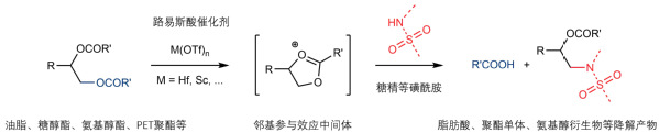 图1. 油脂、多元醇酯、聚酯等与磺酰胺的催化选择性取代反应示意