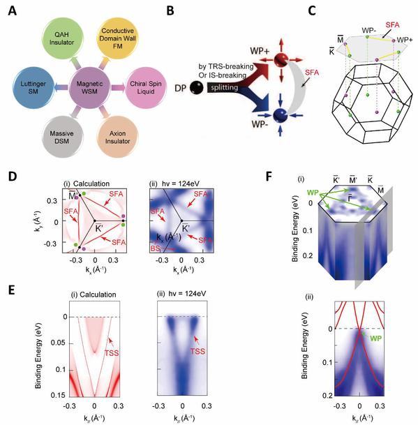 磁性Weyl半金属Co3Sn2S2。(A)磁性Weyl半金属及其丰富的近邻量子态。(B) 时间反演或空间反演破缺使狄拉克费米子(DP)劈裂产生一对手性相反的外尔费米子(WP)以及连接它们的费米弧表面态(SFA)示意图。(C)Co3Sn2S2中外尔点和费米弧表面态的分布示意图。(D) 费米弧表面态所形成费米面的理论计算(i)和实验结果(ii)比较。(E) 费米弧表面态的能带色散的理论计算(i)和实验结果(ii)比较。(F)费米面上的Weyl点(i)及其能带(ii)的三维演示;(ii)中过Weyl点的线性色散为(i)中灰色平面位置所切取,红色的叠加曲线是理论计算结果。