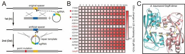 研究人员发现鲍曼不动杆菌自身的重组系统,以及广泛使用的来自于大肠杆菌噬菌体的λ-Red和RecET重组系统均不能介导鲍曼不动杆菌中CRISPR-Cas9造成的基因组双链DNA断裂的修复。然而,一种来自于鲍曼不动杆菌特殊菌株IS123的RecAb重组酶系统能够高效修复鲍曼不动杆菌中CRISPR-Cas9造成的基因组双链DNA断裂。因而,通过联合RecAb和CRISPR-Cas9, 研究人员建立了鲍曼不动杆菌中pCasAb-pSGAb/RecAb基因组编辑平台,在不同鲍曼不动杆菌菌株中均实现了高效且无痕的基因删除和插入操作。同时,研究人员还基于pCasAb/pSGAb双质粒系统,提出了一种两步法In-Del策略,可对鲍曼不动杆菌基因组任意位点进行精确的点突变操作。通过应用In-Del策略,研究人员对OxyR蛋白活性口袋中的13个保守氨基酸执行了丙氨酸扫描突变,揭示了新的活性氧感应机理。