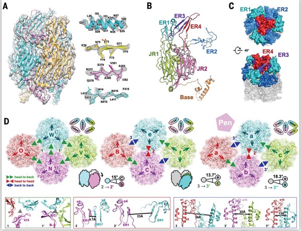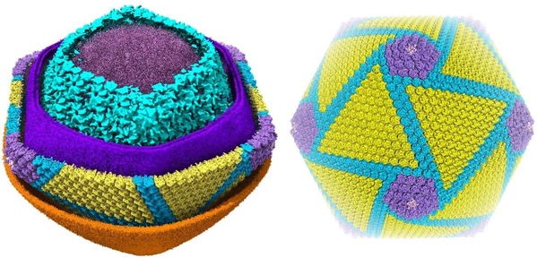 非洲猪瘟病毒整体结构(左:5层切面图;右:衣壳层整体结构)
