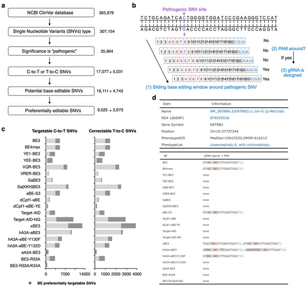 图1:计算生物学方法预测可编辑的致病突变位点及BEable-GPS数据库构建。(a)可编辑的人类疾病相关单碱基突变位点的筛选流程。(b)判断人类疾病相关单碱基突变位点能否被碱基编辑器编辑的流程示意图。(c)统计20种碱基编辑器可编辑的人类疾病相关单碱基突变位点的数目。(d)BEable-GPS分析显示一个可编辑的人类疾病相关单碱基突变位点信息及相应单碱基编辑器的gRNA设计结果。