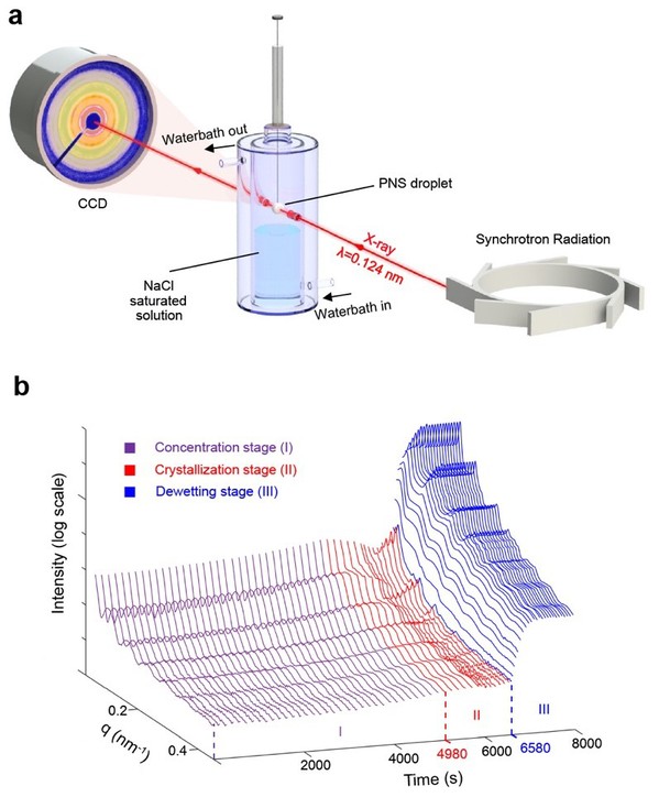 近日,我校物质学院陈刚教授课题组在胶体纳米颗粒自组装研究方面再次取得重要进展。该研究应用同步辐射X射线小角散射(SAXS)手段,原位观测了胶体液滴的蒸发自组装过程,揭示了胶体粒子的结构演变和蒸发动力学过程。日前,该成果以“Dynamic Crystallization and Phase Transition in Evaporating Colloidal Droplets”为题,在知名学术期刊《Nano Letters》上在线发表。