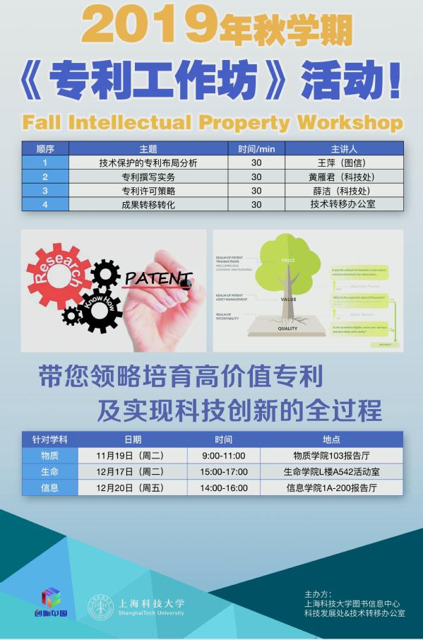 在“大众创业、万众创新”的国家战略背景下,为了帮助科研人员更好地进行创新研究,保护创新技术,实现创新创业,2019《专利工作坊》将分别针对物质、生命、信息三个学科的特点,走进各院所,基于各学科领域案例,通过组织三场不同学科背景的专利工作坊活动,引导学员们提升技术保护和运营的能力。