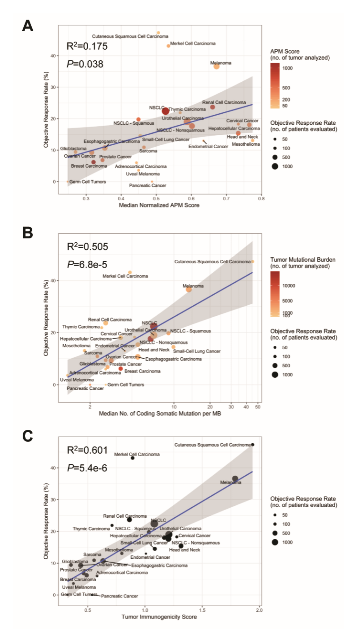 相较已知的肿瘤免疫治疗标志物如,PD-L1表达、肿瘤突变负荷(Tumor mutational burden, TMB)以及干扰素g基因表达模式等,TIGS表现出更为优异的免疫治疗临床效果预测能力(图1)。同时TIGS在预测不同类型肿瘤对免疫检查点抑制剂的客观反应率(objective response rate)时,效果要优于已知的标志物,如TMB(图2)。这提示TIGS能够作为广谱的、非肿瘤类型依赖的免疫治疗效果预测标志物。
