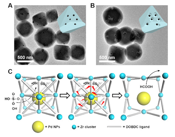 该工作首先选用2,5-二羟基对苯二甲酸(DOBDC)为配体合成MOF内核,随后选用其他配体合成通过外延生长获得一系列壳-核MOFs结构。DOBDC由于特定的化学结构使其易受到硝酸(HNO3)和活性氧种(Reactive Oxygen Species,ROS)的进攻。更有意思的是,由于HNO3和ROS刻蚀机理的不同,研究者们发现他们能分别由内到外地或由外到内地侵蚀MOF核,并最终获得形貌一致的中空单晶MOF颗粒。这些中空单晶MOFs由于没有晶界,几乎不存在缺陷缝隙,因此能利用MOF壳层的超小孔道实现完美的尺寸选择催化。通过对刻蚀机理分子层面的深入认识,研究者们发现硝酸和ROS能够选择性地将DOBDC配体剪切成小分子碎片,进而实现可控刻蚀。当在MOF的内核中预先包埋Pd纳米颗粒,ROS则能够定点地在Pd表面生成。这使得刻蚀被限于在Pd颗粒周围,最终形成所谓的Multi-Yolk-Shell(MYS)结构。在实际模型分子催化氢化实验中,具有MYS结构的催化剂不仅能加速反应底物的扩散,还能有效抑制Pd纳米粒子催化剂在高温下的团聚现象。由于MOFs材料配体的多样性以及有机化学中选择性分子剪切反应非常丰富,本工作中提出的方法起到了抛砖引玉的作用,为今后合成制备具有更复杂形貌的等级MOFs材料提供了新思路。