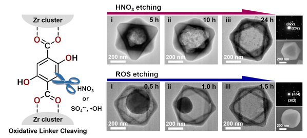 图1.壳-核MOFs被HNO3和ROS由内到外地或由外到内地侵蚀过程。