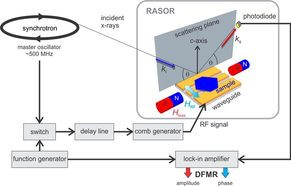 为了解决这一问题,张石磊团队利用同步辐射软X射线的多维度参量(能量、动量、偏振、时间分辨),开发了“双共振散射”实验。这一手段核心的原理在于同步辐射的X光并非连续入射,而是以接近500 MHz的频率一束一束发射。每一束光的时间宽度为35ps。换句话说,对于大多数同步辐射实验,如果体系的动力学与500 MHz无关,则这一属性与连续光无异。然而,对于关联磁性体系,500 MHz的倍频(1 GHz-6 GHz)刚好在铁磁共振的频率范围。在实验上,研究团队设计了独特的与光源匹配的共振弹性X光散射(REXS)环境,使得驱动X光的微波在引发样品铁磁共振的同时,同步的X光用REXS的方式去探测某一个“冻结”时刻的磁结构。通过一系列频闪观测的方法首次重构出了整个铁磁共振的全部过程。实验的空间分辨率为原子级别,可对磁矩的三个分量独立分辨,时间分辨率为35ps。通过对共振过程的精确表征,磁振子在量子层面的物理机制亦可完全被揭示。值得一提的是,该工作基于英国钻石光源,光束宽度仅为35ps。而在上海光源的光束宽度可以达到15ps,且光通量更大。将更高质量的双共振散射在上海光源S2光束线实现是课题组下一步的目标。