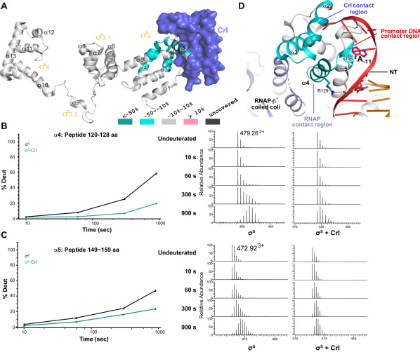 图1. 氢氘交换质谱实验揭示Crl通过稳定sigmas的构象促进sigmas-RNAP全酶的组装。(A)sigmas上位于其与Crl互作表面的氨基酸在结合Crl后相对于结合前其氢氘交换速率发生了非常明显的下降。图中,氢氘交换速率下降的区域标示为青色,增加的区域标示为粉红色,无变化的区域标示为灰色。深灰色则表示在氢氘交换质谱实验中未能涵盖的区域。(B-C)在未结合和结合Crl的情况下,来自alpha螺旋4(B)和螺旋5(C)的肽段的氘吸收对比图(左)和质谱对比图谱(右)。(D)sigmas上在Crl结合后氢氘交换速率发生明显下降的区域(螺旋4和螺旋5)在全酶中分别与RNAP-beta′亚基和启动子DNA接触,提示其构象的稳定可能促进sigmas与RNAP和启动子DNA的相互作用。