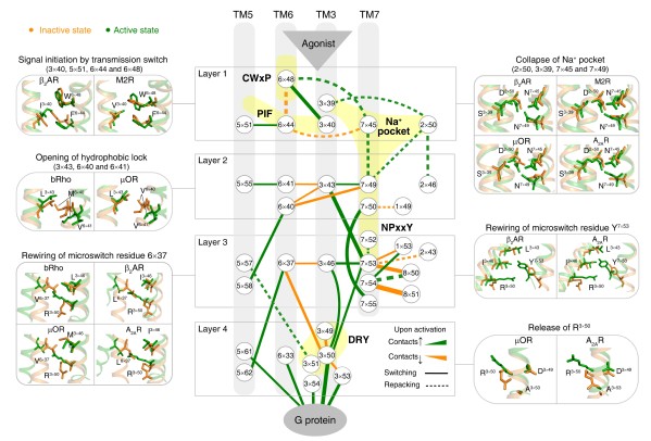 在本次发表的文章中,研究人员开发了一个计算生物学框架来定量和系统地描述激活过程中的构象变化,即用残基接触打分(Residue-residue contact score, RRCS)评价残基对接触强度(Residue-residue contact strength),从而将三维的结构信息转化为二维的残基接触打分网络并由此实现对激活过程中残基构象变化的精确描述。通过对A家族45个受体的234个结构的RRCS分析,我们首次发现A类GPCR中存在一条由34组残基对构成的共同激活通路。这一通路完整连接配体结合口袋和G蛋白偶联区域,并有机整合这些序列保守但空间疏离的模体(如CWxP、PIF和Na+ pocket和NPxxY等),在残基层面揭示了GPCR如何被激活、TM6为什么会翘起、各模体间如何相互配合完成跨膜信号转导的机制和过程。