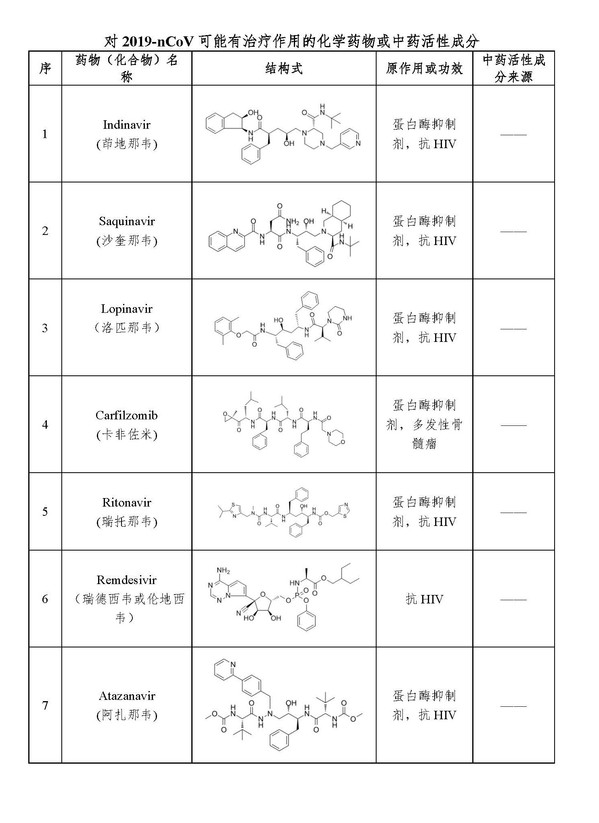 上科大饶子和/杨海涛团队快速表达了2019-nCoV水解酶(Mpro)并获得了高分辨率晶体结构,在此基础上,联合小组综合利用虚拟筛选和酶学测试相结合的策略,重点针对已上市药物以及自建的“高成药性化合物数据库”和“药用植物来源化合物成分数据库”进行了药物筛选,迅速发现了30种可能对2019-nCoV有治疗作用的药物、活性天然产物和中药(详见附表),建议在2019-nCoV感染肺炎患者临床治疗中予以考虑和关注。