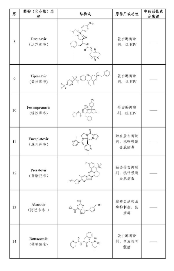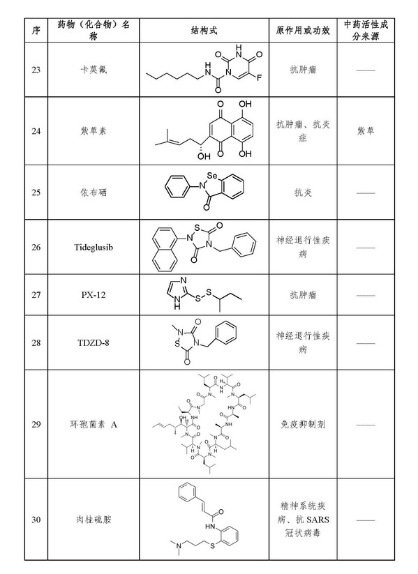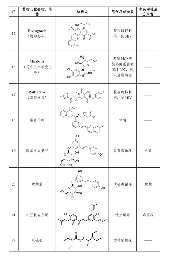 候选药物包括蛋白酶抑制剂茚地那韦(Indinavir)、沙奎那韦(Saquinavir)、洛匹那韦(Lopinavir)、卡非佐米(Carfilzomib)、利托那韦(ritonavir)等12种抗HIV药物,2种抗呼吸道合胞病毒药物,1种抗人巨噬病毒药物,1种抗精神分裂症药物,1种免疫抑制剂以及2种其他类药物;发现含有“二苯乙烯”结构的孟鲁司特以及植物药活性成分虎杖苷和脱氧土大黄苷与Mpro结合较好,可能对病毒有抑制作用;在前期抗SARS研究及计算机模拟基础上发现老药肉桂硫胺、环孢菌素A可能对2019-nCoV有效,其中肉桂硫胺是上世纪70年代用于抗精神分裂症的药物,对冠状病毒3CL水解酶具有抑制作用,免疫抑制剂环孢菌素A可以阻止病毒的核衣壳蛋白与人的环孢亲和素A相互结合,已有研究表明联用干扰素和环孢菌素A能显著抑制冠状病毒在人类支气管和肺部复制及造成的组织损伤。他们研究还发现,虎杖、山豆根等中药材中可能含有抗2019-nCoV有效成分。