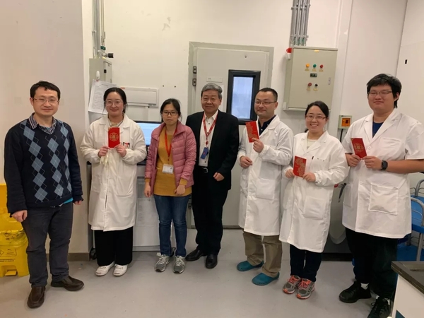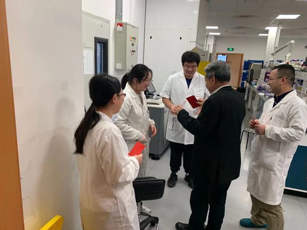 饶子和院士(左四)慰问年三十坚守攻关课题的科研人员和学生(左一为杨海涛,左三为杨秀娜)
