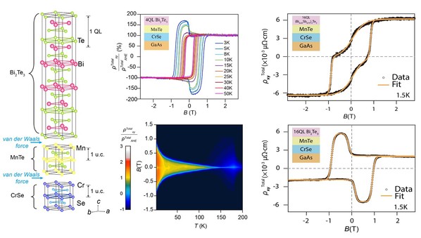 磁性拓扑绝缘体中因其集多种物理相为一身的特点,成为凝聚态物理与自旋电子学的研究热点,近年来许多新奇物理现象的发现均与该体系息息相关。相较于传统的磁性掺杂方法,磁性拓扑绝缘体异质结通过将拓扑绝缘体与高温磁性材料的有机结合,一方面可以获得磁性的增强,另一方面可以利用不同耦合机制的分离对磁序和拓扑序分别进行独立剪裁,从而实现对电子自旋态的操控。正因如此,合理构筑基磁性拓扑异质结体系将极大推动拓扑量子材料在自旋电子学方面的应用前景。针对上述科学问题,近日,我校拓扑物理实验室寇煦丰团队(信息学院)和张石磊团队(物质学院)利用分子束外延(MBE)技术制备出基于(BixSb1-x)2Te3/MnTe的磁性拓扑绝缘体异质结复合体系,同时通过精确的层厚和掺杂变化实现了对该体系中反常霍尔效应的有效调控。该研究成果以“Tailoring the hybrid anomalous Hall response in engineered magnetic Topological Insulator heterostructures”为题发表在国际知名学术期刊Nano Letters。