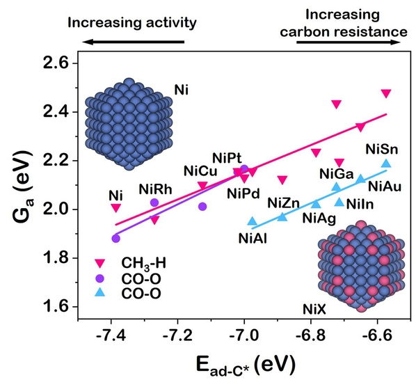 图注:不同金属助剂掺杂的镍基催化剂表面甲烷与二氧化碳解离自由能垒随表面碳吸附能的变化趋势。若甲烷解离能垒高于二氧化碳解离能垒则抗积碳能力较强,若二者均较低则催化活性较高。