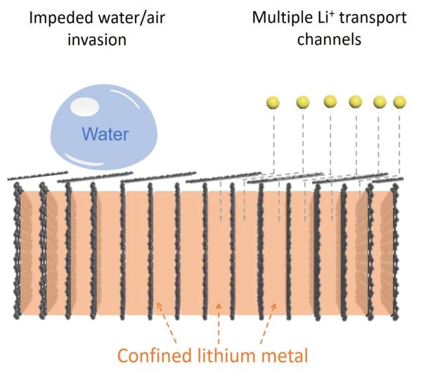 图注: 具有层次结构的石墨烯锂金属负极。 垂直结构的石墨烯阵列可以有效的负载锂金属,上层致密的石墨烯层在保持良好水气隔绝的情况下具有多重离子传输通道。