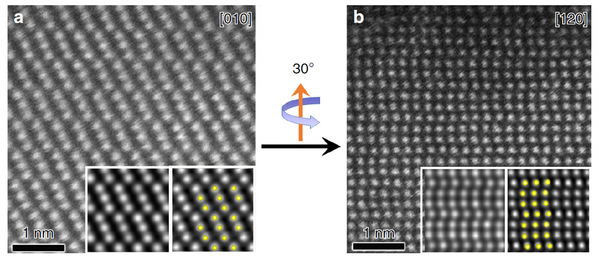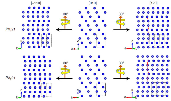 在该工作中,研究人员首先选择了具有P3121和P3221空间群的手性碲(Te)晶体作为研究对象,在结构模型中可以看出(图1),沿[010]方向左右手性结构的投影相同,而将结构模型沿c轴逆时针旋转至[120]带轴时,两个手性结构的投影就不再相同。通过拍摄[010]和[120]带轴方向的系列倾转扫描透射电子显微镜高分辨图像(图2),结合[120]方向中Te原子排列在水平方向上的弯曲方向,可以判定该颗晶体为左手手性。研究人员也选用了具有P6222和P6422空间群的手性二硅化钽(TaSi2)作为研究对象,进一步验证了该方法的可行性和普适性。