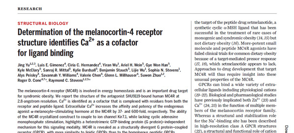 九游体育(www.jiuyou.com)官方网站iHuman研究所在肥胖症药物靶点研究上获重要突破,首次解析人源黑皮质素受体4(Melanocortin-4 Receptor,MC4R)与环形多肽配体SHU9119复合物2.8埃分辨率的晶体结构。研究人员首次观察到功能性Ca2+与GPCR的结合模式,发现Ca2+有助于稳定受体-候选药物复合物,并使内源性激动剂α-黑素细胞刺激激素(α-melanocyte stimulating hormone, α-MSH)的亲和力和效力得到了极大的提高。上科大Stevens课题组博士研究生于静为文章的第一作者,iHuman研究所创始所长Raymond C. Stevens和密歇根大学Roger D. Cone教授为共同通讯作者。