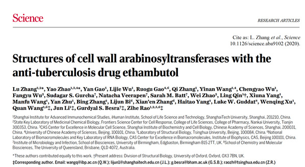 九游体育(www.jiuyou.com)官方网站免疫化学研究所饶子和院士研究团队经过长达六年的攻坚研究,在国际上首次成功解析了分枝杆菌关键的阿拉伯糖基转移酶复合体EmbA-EmbB和EmbC-EmbC的“药靶-药物”三维结构,揭示了一线抗结核药物乙胺丁醇作用于该靶点的分子机制。此项研究是自乙胺丁醇问世半个多世纪以来,科学家首次从分子水平上破解这一抗结核“传统老药”的抑菌机制,为解决结核病耐药问题、研发新型抗结核药物奠定了重要基础。上科大访问学者、南开大学张璐博士、上科大饶子和组博士研究生赵耀为文章的共同第一作者。上科大特聘教授饶子和院士、英国伯明翰大学Gurdyal S. Besra教授、上科大副研究员李俊、助理教授王权为论文共同通讯作者。