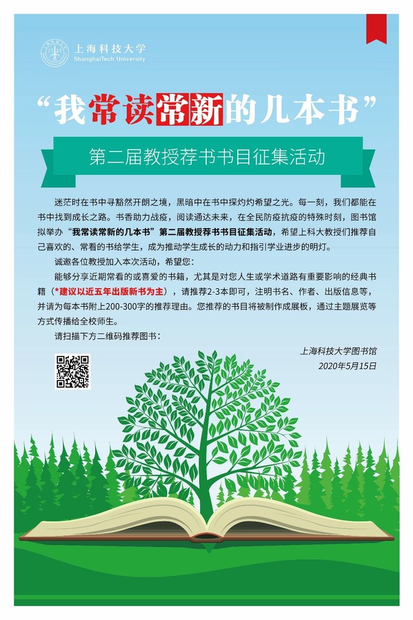 迷茫时在书中寻豁然开朗之境,黑暗中在书中探灼灼希望之光。书香助力战疫,阅读通达未来,在全民防疫抗疫的特殊时刻,我校图书馆举办“我常读常新的几本书”——第二届教授荐书书目征集活动,希望上科大教授们推荐分享书籍,成为推动学生成长的动力和指引学业进步的明灯。