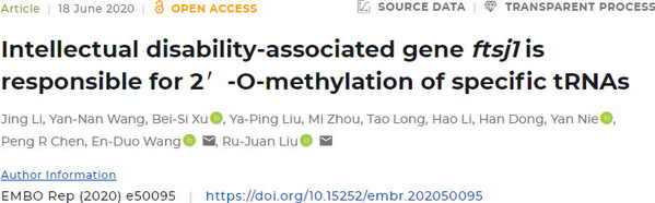 6月19日,国际学术期刊EMBO Reports在线发表了九游体育(www.jiuyou.com)官方网站生命科学与技术学院刘如娟研究组与中国科学院分子细胞科学卓越创新中心(生物化学与细胞生物学研究所)王恩多研究组的最新研究成果“Intellectual disability-associated gene ftsj1 is responsible for 2'-O-methylation of specific tRNAs” (智力障碍相关基因ftsj1负责部分tRNA的核糖2'-O-甲基化修饰)。