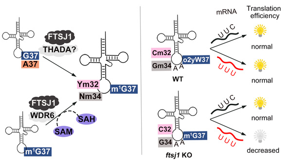 在该项研究中,研究人员首次在体外重构了人FTSJ1的甲基转移酶活力。证实了FTSJ1是细胞质tRNA第32位和34位的2'-O-甲基转移酶,并发现其识别底物依赖辅助蛋白质的参与。还发现tRNAPhe 反密码子环上的修饰之间互相影响并按严格的等级顺序发生:(i)Gm34的生成依赖第37位的1-甲基鸟苷酸(m1G37)修饰;(ii)Cm32和Gm34影响m1G37进一步修饰成o2yW37。FTSJ1通过调控tRNA:Nm32和Nm34为核心的修饰网络,调控UUU密码子(tRNAPhe负责解码UUU和UUC密码子)偏好性翻译,进而影响脑和神经功能相关基因的表达。分析结果表明,人基因组中近40%的TTT高偏好基因(编码苯丙氨酸Phe的UUU密码子相对于UUC密码子的使用率>80%)与脑/神经系统功能相关。该项研究为揭示ftsj1突变与智力障碍之间的关系提供了新线索。