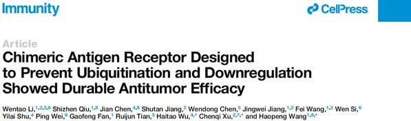 北京时间8月5日,我校生命学院王皞鹏课题组联合中科院分子细胞科学卓越创新中心许琛琦实验室、复旦大学附属眼耳鼻喉科医院吴海涛课题组,在《免疫》(Immunity)上以封面文章的形式发表了题为“Chimeric Antigen Receptor Designed to Prevent Ubiquitination and Downregulation Showed Durable Antitumor Efficacy”(具有持久抗肿瘤效果的新型可循环嵌合型抗原受体)的研究论文,提出了一种新型的“可循环CAR”设计方案,显著地提高了CAR-T细胞在体内的持续活性和抗肿瘤效果,为防止CAR-T治疗后的肿瘤复发提供了新策略。