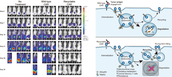 可循环CAR的疗效和机制: 左图:可循环CAR-T细胞高效地清除体内肿瘤。右图:肿瘤抗原的结合导致CAR受体的泛素化修饰,泛素化的CAR受体被运输到溶酶体进行降解;可循环CAR受体不再被溶酶体降解,而是聚集在“内体”中进行信号转导,并且被输送回到CAR-T细胞表面,促进了CAR-T细胞抗癌活性。