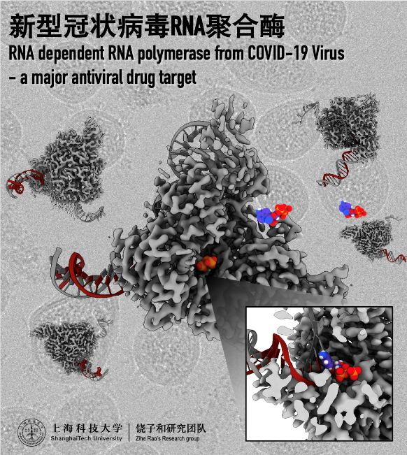 “RdRp-nsp7-nsp8”复合物结构由饶子和/王权团队和清华大学娄智勇团队合作完成,于4月10日以题为“Structure of the RNA-dependent RNA polymerase from COVID-19 Virus”的研究长文在《科学》(Science)发表。RdRp及其辅助因子与RNA和抗病毒候选药物瑞德西韦复合体的三维结构由饶子和/王权团队和中国科学院武汉病毒研究所龚鹏团队合作解析,于5月22日在《细胞》(Cell)发表,题为“Structural Basis for RNA Replication by the SARS-CoV-2 Polymerase”。