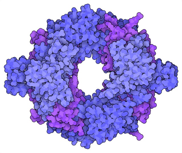 联合团队在国际上首次精细描绘出了新型冠状病毒“RdRp-nsp7-nsp8”转录复制机器处在工作状态下的核心特征,展现了复合体辅助部件参与反应的分子机制和结构基础,并为瑞德西韦和法匹拉韦等候选药物的效应分子精确靶向抑制病毒RNA合成进而发挥药效活性的机制提出了解释。此外,在对SARS冠状病毒nsp7/nsp8十六聚体引物酶的研究基础上,饶子和/王权团队提出了引物酶复合体向复制酶复合体过渡的转换模型,为深入研究新型冠状病毒复制的分子机理奠定了重要的理论基础,并为开发靶向转录复制过程的抗新冠肺炎药物开辟了新途径。SARS冠状病毒nsp7/nsp8十六聚体引物酶复合体(图4)亦作为PDB本月明星分子的关联内容做了重点介绍。