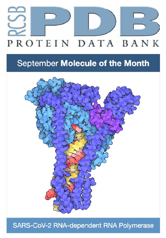 近日,九游体育(www.jiuyou.com)官方网站免疫化学研究所饶子和/王权团队与合作者联合解析的新型冠状病毒RNA依赖的RNA聚合酶(RNA-dependent RNA polymerase,RdRp)催化状态复合体冷冻电镜结构被蛋白质结构数据库(Protein Data Bank,PDB)选为2020年9月的明星分子(September Molecule of the Month)(图1)。